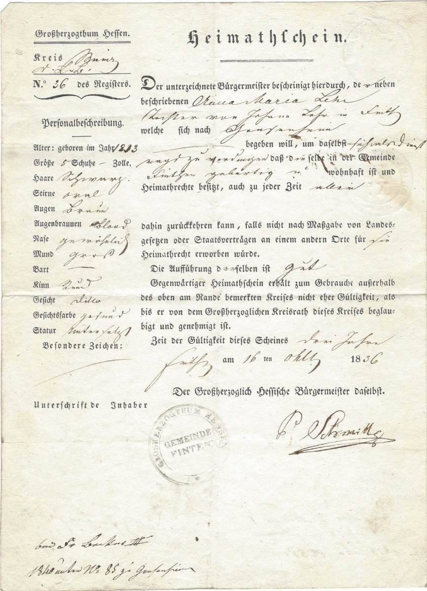 Unser Heimathschein ist ausgestellt von der Gemeinde Finthen, Großherzogtum Hessen, Kreis Mainz, im Oktober 1836 für eine Anna Maria Lehr, geboren 1813 (auch dies schwer zu entziffern). Der Schein enthält links eine Personalbeschreibung, die in unserem Falle eine Frau mit schwarzem Haar, ovaler Stirn, gewöhnlicher Nase und untersetzter Statur beschreibt. Sie scheint eine anständige Frau zu sein, denn der Schein attestiert ihrer Lebensführung: „Die Aufführung derselben ist gut.“